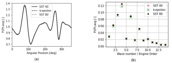 The criterion, applied to check that time periodicity is reached and that the mesh is sufficient, is that the difference in harmonic blade force is less than 1% of the time-averaged force for any frequency considered in the study. We also check that the differences in individual harmonic forces are small as compared with the amplitude of the same specific harmonic. A transient calculation, such as used here, runs for a number of revolutions in order to reach a periodic solution, where data are taken over the last full revolution in each simulation. This is checked by comparing the last full revolution, “Rev N”, to the preceding revolution, “Rev N-1”, shown in Figure 5, and ensuring that the solution does not change significantly. Therefore, the simulations were run for at least two full revolutions with the best resolution. Prior to that, the simulations started from coarser meshes that had been run for several revolutions. A further challenge in the studies is the computational expense involved with a large mesh. Therefore, we check mesh sensitivity by comparing the results to earlier similar analyses using a mesh with less than half the number of nodes, with the same boundary conditions. “Coarse” depicts the coarse mesh also used as a basis for the comparison made in Figure 4, identified as “SST 80”. The small difference show that the resolution and periodicity is sufficient for the study.