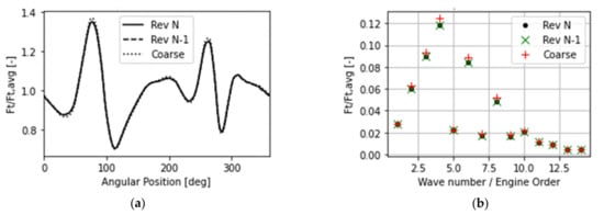 The blades rotate in the direction of decreasing angle. It appears that a correlation exists, where the force increases when is low, although with some shift in location, which is consistent with findings in [10]. In order to further understand the harmonic force, a Fourier transform is used to describe the force per frequency, and wave number. The circumferential wave number of a disturbance is expected to translate into a blade response at a frequency corresponding to the wave number, m, times the shaft rotational speed, often referred to as an engine order (EO). Figure 11b shows, for the first 14 wave numbers, the amplitudes per wave number of the parameter together with the normalized forces at the corresponding frequencies. The first thing to note is that the forcing levels are the highest at EO = 4, and then decrease towards a higher EO and m. Beyond EO 12, the amplitudes are less than 1/10 of the force at EO = 4, and therefore is not considered of interest. Especially from the Fourier coefficients, it is quite clear that the normalized forces are correlated to the distortion pattern, even as described by the relatively crude approximation of radial averages.