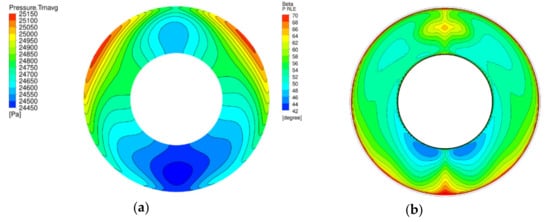 A correlation of high whirl angles is observed where the total pressure is low, thus, likely increasing the aerodynamic load of the blade as it passes through the sector by increasing the incidence on the leading edge. Although causing a redistribution of the flow, the circumferential velocities induced by the effect appear not to be very large in this case, which can be inferred from the relative whirl angles, which are nearly symmetric with respect to the vertical axis.