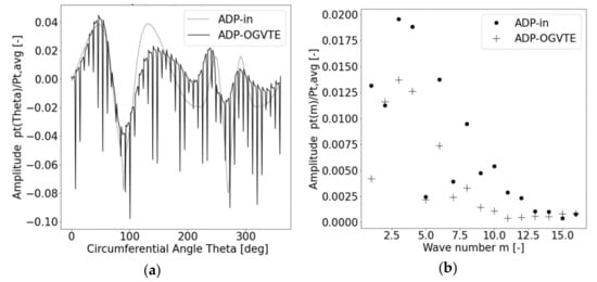 A radially averaged, circumferential variation of the total pressure at the inlet, denoted “ADP-in in the legend and at the plane downstream of the OGV, at X = 0.385, denoted “ADP-OGVTE” in the legend is shown in Figure 9a. This is defined as a mass flow biased average of the total pressure over the radius for each circumferential position extracted at one-degree intervals. The difference in total pressure moving out of and coming into the distorted section is clearly seen here. Apart from the spikes in the “ADP-OGVTE” curves caused by the OGV wakes, the normalized variation also appears to be attenuated to some degree. A more quantitative understanding of the transfer per harmonic is given in Figure 9b. The circumferential variation is shown in terms of Fourier decomposed amplitudes from the same data as in Figure 9a. Apart from wave numbers m = 2 and m = 5, there is a clear reduction in normalized amplitude.