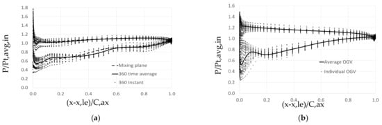 In Figure 10a, individual blade pressure coefficient distributions are shown as dots and the average as a full line. On the x-axis of both plots, the non-dimensional axial distance from the leading edge of the respective airfoil is given; 0 is at the leading edge and 1 is at the trailing edge. The pressure coefficient is defined as the static pressure divided by the mass averaged total pressure at the inlet. For the rotor, this is equivalent to the variation each blade undergoes during one rotation. The variation in the pressure distribution due to the distortion is significant, over the entire chord, which may be expected from the variation in the flow field. The plot also includes the result of a calculation using a mixing plane. The mixing plane is an approximation often used in turbomachinery CFD in order to reduce the computational effort for performance calculations. Over an interface plane, between rotor and stator, a circumferential averaging of the flow is made for each radius. Only the averages are transferred over that interface such that the flow in each blade row receives a steady state flow that is axisymmetric, and thus time invariant in the respective frame of reference. It is of some interest to note that the mixing plane calculation comes relatively close to the average of the transient calculations, as the mixing plane technique was used in the fan design and was reported in [8]. For the OGV shown in Figure 10b, the incidence variation from vane to vane leads to large variations at the leading edge. The view on the OGV is slightly different from the fan blade as this is the time average over each individual vane. Since this is a fixed pattern, individually re-staggering or modifying the vanes could be considered to be a means to mitigate the local incidence effects at ADP. In [18], this is shown effective in substantially reducing separations and losses incurred in the OGV as an asymmetric boundary layer is ingested into the fan.