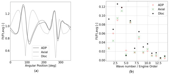 Blade forcing for ADP and Axial with reference distortion Dloc. (a) As a function circumferential position; (b) Fourier component amplitudes.