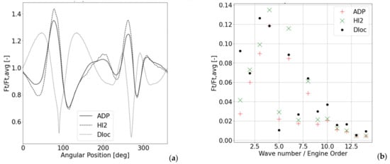 Blade forcing for ADP and HI2 with reference distortion Dloc. (a) As a function circumferential position; (b) Fourier component amplitudes.