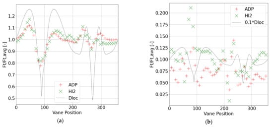 An interesting issue is whether the effect of the total pressure variation over the inlet plane is dominant, or if the swirling flow at the inlet has large effects. This is studied by simply making a comparison of two cases with the same total pressure distribution but different velocity fields at the inflow boundary. The reference model, denoted ADP in Figure 11, uses the total pressure variation and the flow direction taken from the velocity field as computed with the whole aircraft model. The other model, denoted Axial, uses a boundary condition where the same total pressure variation is used as in the reference ADP case, but removing the swirling flow components depicted in Figure 3b. At the inlet boundary, in this case, the flow is axial, but with the same total pressure field. In Figure 11a, the x-axis is the angular position of the rotor could be viewed as negative time passed as the rotor speed is negative. The Dloc parameter, Equation (3), is the radial average of total pressure around the circumference normalized by the dynamic pressure at the inlet, and the definition is: