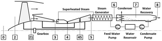 Scheme of a half-side arrangement of the proposed water-enhanced turbofan concept with station nomenclature (taken from []).