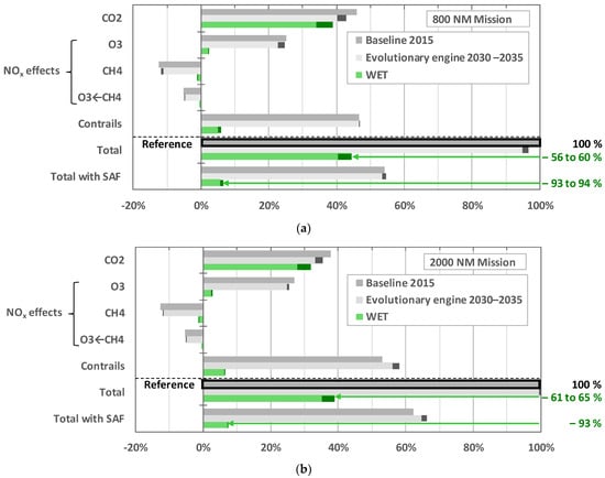 Absolute Global Warming Potentials over one hundred years relative to the total of the Baseline 2015 reference aircraft on missions of (a) 800 NM, (b) 2000 NM. “Contrails” includes contrail cirrus by applying a multiplicator of 5 on the line-shaped results. Ranges are given as range of the SFC reduction potential. No scientific uncertainties concerning the climate impacts are issued.