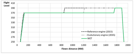 There is also an interesting finding from the 2000 NM stage length calculation: Even if the evolutionary engine consumed significantly less fuel than the baseline, its climate impact in total was not reduced compared to the baseline. This is due to two counter-balancing effects: On the one hand, its CO2 impact has been reduced linearly with regard to fuel burn. On the other hand, the reduction of installed thrust in line with a smaller SFC makes the aircraft step up to Flight Level 390 later in the mission. However, according to LEEA results [], Flight Level 370 is more sensible to contrails than Flight Level 390. PIANO optimizes a mission for fuel burn. In this case, optimizing for fuel burn does not minimize climate impact. The effect is even more pronounced for the WET aircraft, both due to a further reduced SFC and a significant increase in weight due to the WET installation. The missions are presented in Figure 3.
