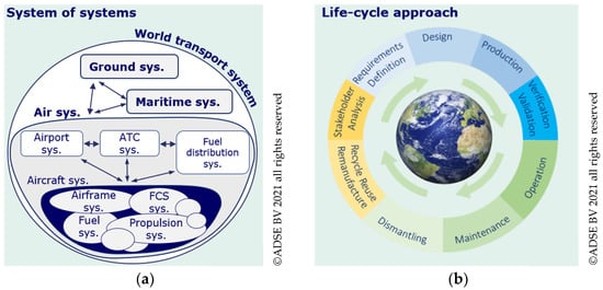 Taking this holistic view is important to grasp all aspects of the “larger” system and the stakeholders involved. The system of systems is one part of identifying the “larger” system, while another is the life-cycle approach shown in Figure 2b. Especially for sustainability, this shows that one should not only look at the operational period, but also all other sections of the life cycle to build a “green” solution. The needs and the requirements definition shall drive the design process to achieve a sustainable product in its life cycle, whilst still satisfying the stakeholders’ needs within the systems of systems. The design decisions will drive emissions during all parts within the life cycle, which includes production, the operational phase, as well as end of life and recycling.