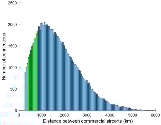Number and distance of flight connections in the EU (plus Great Britain, Norway, and Switzerland) concerning commercial airports in operation (blue + green)—feasible connections for regional air traffic (green). All connections of more than 6000 km are not displayed.