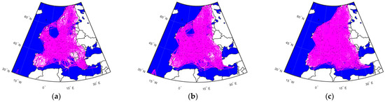 Coverage area of European commercial airports with an assumed catchment radius of (a) 100 km, (b) 50 km, and (c) 50 km considering all airfields of at least 1000 m runway.