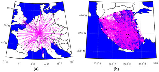 Example (a) Connections from Strasbourg (SXB) between 350–800 km, Example (b) Feasible domestic flight routes of Greece between 150–800 km.