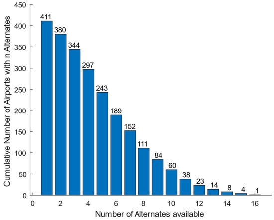 For the first case, having already reached the destination and being required to divert, Figure 7 shows the number of potential alternates for airports in the EU (including Great Britain, Norway, and Switzerland). Out of the 414 commercially operated airports with a field length above 1000 m, 3 have no alternate within the defined reserve distance. This yields more than 99% of airports adequately covered. Over 90% have more than one alternate within reach. To correctly define airports with missing alternates, airports in Serbia, Bosnia, and Herzegovina, Montenegro, Kosovo, Albania, North Macedonia, Belarus, and Ukraine were added in all reserve analysis. Here, the same criteria for the airport selection have been applied (field length of at least 1000 m and yearly passenger volume of at least 15,000).
