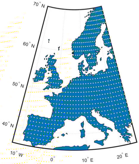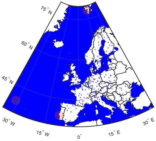 At first, the coverage of airports in the EU plus Great Britain, Norway, and Switzerland is analyzed (see Figure 3). This leads to a number of 414 airports with a field length of more than 1000 m (430 airports for 800 m, respectively) that have a volume of more than 15,000 passengers per year according to the data of the reported airports by Eurostat in 2019 [], excluding overseas departments. It is expected that these airports are commercially in use. Under the assumption of a 100 km catchment area around the airports, major parts of the EU are already covered. We expect that a larger catchment area does not result in any advantages for the traveler, since no time advantage is expected. Furthermore, we assumed that no emission savings can be achieved for a catchment area of more than 100 km.