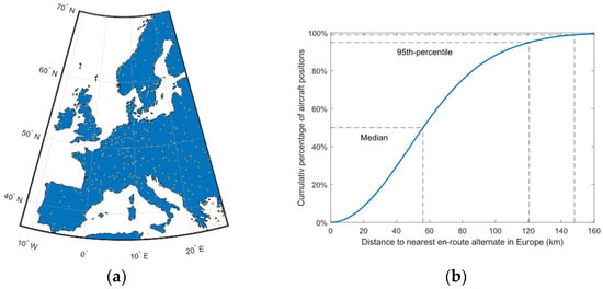 With the help of the mission statement, the top-level aircraft requirements were defined. These requirements set the criteria that must be fulfilled by the system to be designed. Considering not only environmental aspects, but also the performance of the system should satisfy the operators and stakeholders. These specifications ensure that the aircraft to be developed can occupy its planned niche within the system of systems. In addition, we took a closer look on the defined reserve distance and range requirements. The study for the reserve policy shows that—including a safety factor—more than 95% of the investigated commercial airports have at least one alternate within 185 km. En route alternates are expected to be less problematic if the hybrid-electric aircraft is sized properly with enough redundancy for the different energy sources. The study has shown that most parts of the EU can be covered, and more than 10,000 connections are possible; this represents around 15% of possible connections within Europe above 250 km. In the future, further analyses could be performed for other regions of the world: Mountainous regions or island operations might be of particular interest. Examples could be the Andes or the Himalaya for the former, and the Caribbean or Southeast Asia for the latter.