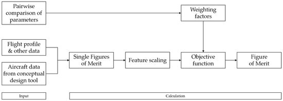 With the selected figures of merit, a new process becomes necessary: The separate figures of merit presented before must be merged into one single aircraft-level figure of merit which evaluates the entire aircraft configuration []. This helps by comparing different concepts and identifying which of the designs is the most promising one for further development. The scheme of this method is shown in Figure 13.