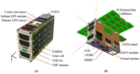 STEP Cube Lab-II’s mechanical configurations: (a) solar panel stowed and (b) solar panel deployed.