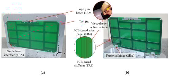 Figure 3a,b show the demonstration model of a highly damped deployable solar panel module’s stowed and deployed configurations, respectively. The solar panel module is comprised of a PCB panel with thin stiffeners attached by adhesive tapes, a three-pogo pin-based HRM, and torsional hinges. The PCB panel of dimensions 325.4 mm × 193 mm × 1.6 mm is made up of FR4 material and provides a mechanical interface for mounting solar cells and stiffeners. Five layers of thin 0.4 mm FR4 PCB stiffeners, as shown in Figure 3, were mounted on the rear surface of the PCB panel through double-sided 3MTM 966 acrylic tapes [22]. The 3MTM 966 acrylic tape is a high-temperature adhesive that has been used in aerospace applications that comply with ASTM E596 low volatility specification criteria for space application of the National Aeronautics and Space Administration (NASA). For the attenuation of transmitted launch loads on the panel, the fundamental principle is based on constrained layer damping accomplished by the shear deformation characteristics achieved between interlaminated thin stiffeners and adhesive tapes. The basic specifications of the materials used in the solar panel module are listed in Table 4.