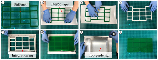 The stiffener attachment process on the panel is considerably simple, although the uniform bonding strength distribution in the workmanship should be controlled with intensive care. Therefore, for symmetrical attachment and easy integration of the stiffeners, four guide holes were made on the four edge corners of the PCB panel and stiffeners. The stiffener attachment process on the PCB panel is shown in Figure 4. First, prepare the materials and integration tools such as PCB panel, stiffeners, 3M966 tape, integration jig, isopropyl alcohol (IPA), torque wrench, knife, and cleaning cloth, then wipe the stiffeners and PCB panel by using a cloth moistened with IPA to remove dust contamination. The tape was cut according to the shape of the stiffener by a knife tip, put into the integration jig through the guide hole interfaces, and the process was repeated up to the specified number of stiffeners that had to be attached to the panel. The PCB panel should be placed on the last stiffener attached to the tape, and then the top guide jig has to clamp with M3 bolts fastened on the jig through a torque of 1.1 Nm to create a compression force on the specimen. As recommended by the adhesive tape datasheet [22], the adhesive bonding resin of the attached tapes must be cured for up to 72 h for secure attachment.