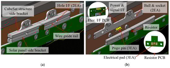 Figure 5a,b illustrate close-up views of the proposed three-pogo pin-based mechanism in fully and partially stowed solar panel states, respectively. The mechanism comprises pogo pins, electrical interface PCB, brackets, Dyneema wire, resistor, and resistor PCB. Park et al. [23] and Bhattarai et al. [24] investigated the applicability and effectiveness of two pogo pins in HRM, although the main purpose of using three pogo pins in the proposed mechanism is to simplify the electrical circuit by reducing the electrical components to lower the cost of the product and increase its reliability for secure release action in a harsh space environment. The main design driver for the use of the pogo pin (MP511-1111-E03100A, CFE Corporation Co., Guangdong, China) [25] connectors is the establishment of a secure electromechanical connection between the electrical interface PCB and the resistor PCB integrated at the edge of the CubeSat structure and solar panel edge, respectively. The pogo pins provide electrical current to the resistor mounted on the resistor PCB during mechanism activation. The holding constraint on the solar panel at the stowed state is achieved by tightening the Dyneema wire on the brackets. Mechanical restraint in the in-plane direction of the solar panel during the stowed configuration is accomplished by ball and socket joints made on the brackets that act as a mechanical limiter to avoid the adverse panel strike on pogo pins beyond the pogo pin’s plunger working stroke range. Additionally, the socket limits ball movement within a nominal gap, which averts the burden at the wire knot under vibration environments. To release the holding constraint on the solar panel, a resistor (3216 SMD type, Walsin Technology Co., Taipei, Taiwan) [26] was integrated on the resistor PCB as an actuator. As the mechanism is activated by the power supply in an electrical circuit, the resistor cuts the tightened wire. The panel deployment is initiated instantly by the compression force of the pogo pin plunger, 0.68 ± 0.19 N, which could rapidly or simply interrupt the circuit path to the resistor. Consequently, the hinge torsional forces deploy the solar panel to its intended angle. Table 5 lists the specifications of the hardware used in P-HRM.