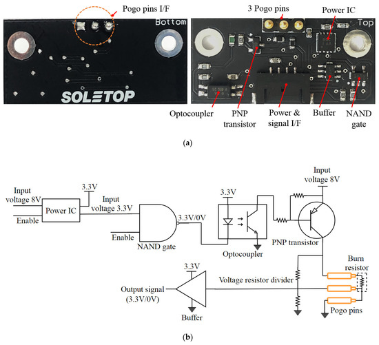Figure 6a,b illustrate the electrical system of the three-pogo pin-based mechanisms. For mechanism activation, the input voltage on the electrical circuit path to the resistor was applied to 8V, although the electrical components were supplied at 3.3 V. The optocoupler (PC817) [27] transmits electrical signals by light between two electrically isolated circuits, thus preventing high-voltage electrical malfunctions in the circuit. The power cutoff function on the mechanism is accomplished instantly after the deployment of the solar panel with the electrical circuit shown in the block diagram without employing a microcontroller unit (MCU).