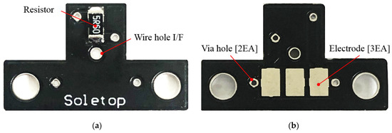 Figure 7a,b illustrate resistor PCB’s front and rear views, respectively. A resistor as an actuator for solar panel release is soldered on the front side of the resistor PCB, which faces the outward direction while integrating on the solar panel. To interconnect the electrical power coming from the pogo pins to the resistor, three surface-mounted electrodes were attached to the rear surface of the resistor PCB that was mechanically connected to the resistor internally. Additionally, two via hole interfaces were made near the electrodes that were physically connected to the electrodes. In general, thermal vias are well-known methods used to enhance the heat dissipation of surface-mounted components in a PCB. However, the application of vias in the resistor PCB is to make electrodes more securely attached to the PCB surface in order to avoid the risk of electrode pad detachment due to pogo pin friction under launch vibration loads. Bhattarai et al. [24] performed a scanning electron microscope (SEM) inspection of the electrode pads after completing all the vibration tests to evaluate the frictional impact or damage caused by the tip of the pogo pins, even though the spring-loaded pin has a low friction impact on vibration loads. The thickness of the electrical contact part or curvature tip on the electrodes was only reduced by 23.88% compared to that of the 60.37 μm initial thickness. The frictional impact on the electrode under vibration load is minimal; thus, a secure physical contact can be assured even after being exposed to severe launch vibration loads because of the 1.7 mm full stroke of the spring-loaded pin of the pogo pins.