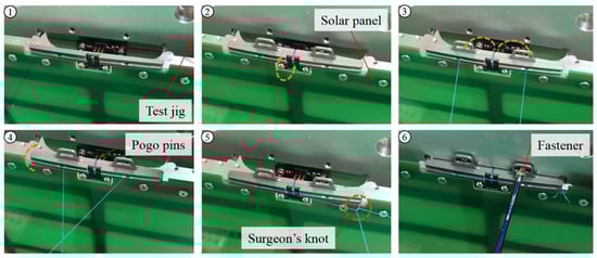 The wire-tightening procedure on the brackets for the solar panel’s holding mechanical constraint is shown in Figure 8. Dyneema wire (YGK G-Soul) [29] (diameter 0.20 mm) is wound on the brackets that can bear maximum strength of 88.2 N; the panel-holding capacity can be further increased with the wire-winding numbers. The surgeon’s knot is carried out at the bracket corner for the final knotting of the wire, which helps to create a steady tight tension on the wire knot. For reliable panel release, physical contact of the wire to the resistor is mandatory. Thus, the notching guide rail is made on the bracket’s surface to prevent wire misalignment from the resistor surface under launch vibration loads. Additionally, the combination of vertical and horizontal cross-pattern winding of the wire with two additional hole interfaces in the brackets creates a secure holding constraint on the panel. The process of wire tightening to stow the solar panel is therefore significantly simpler and more reliable than conventional mechanisms.