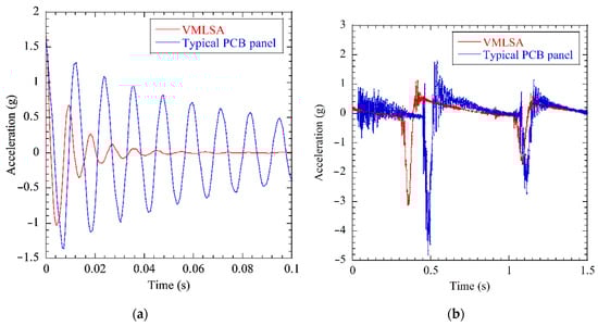 In the constrained layer damping strategy, the transmitted vibration energy dissipation is highly dependent on the viscoelastic core layer thickness, dynamic modulus, thickness of constraining layers, and vibration frequency [30,31]. Therefore, a solar panel free-vibration test was executed at 25 °C ambient room temperature under the boundary condition in which the interfaces of the hinge and HRM holes were rigidly clamped. The roving hammer method was used to excite the solar panel in its free vibration. An accelerometer sensor was mounted at the solar panel center to obtain the time-domain frequency responses. To investigate the design usefulness or practicality for rapid suppression of panel chattering vibration during its in-orbit performance, the solar panel module’s acceleration profile under deployment was also measured in the same room temperature environment. The dynamic characteristics investigation tests of a typical PCB panel of the same size without attaching additional stiffeners were also performed to compare the results obtained from the VMLSA. Figure 9a,b show the solar panel time histories in the free-vibration tests at the rigidly mounted condition and the acceleration profile under deployment, respectively. The results illustrate that stiffeners with viscoelastic acrylic tape can effectively suppress the transmitted vibration on the solar panel.