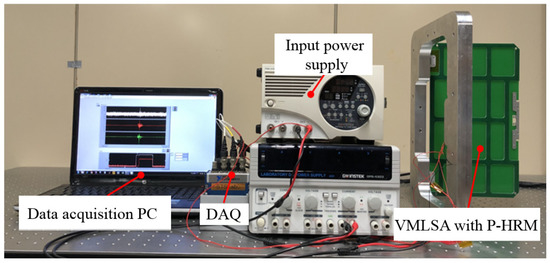To validate the proposed mechanism’s stable release function, the deployment tests of the solar panel were executed at an ambient room temperature of 25 °C with the experimental test setup shown in Figure 10. The qualification model of the P-HRM electrical system illustrated in Figure 6 was electrically connected to a power source for the triggering mechanism and a data acquisition (DAQ) system to determine the solar panel deployment status. In addition, an accelerometer at the center of the solar panel was attached to measure the panel acceleration responses. The solar panel’s random equivalent static analysis result showed that at least triple wire winding is required to secure a positive margin with a safety factor of 3, which is not shown here. Thus, to stow the solar panel as it is in launch configuration, triple wire winding was performed as described in the above-mentioned wire-tightening procedure.