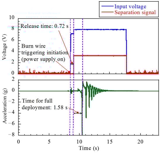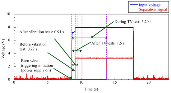 Figure 11 shows the VMLSA release function test results. The time history of the input voltage in the mechanism and separation signal indicated that the solar panel is released at 0.72 s from the power triggering in the circuit. The solar panel’s acceleration response indicates that the complete deployment of the panel took 1.58 s after the release action was completed. The test results validated the release function of the mechanism. As intended in the design, the deployment status of the solar panel was confirmed according to the electric current flow status through the resistor mounted on the resistor PCB using pogo pins and a voltage divider circuit.