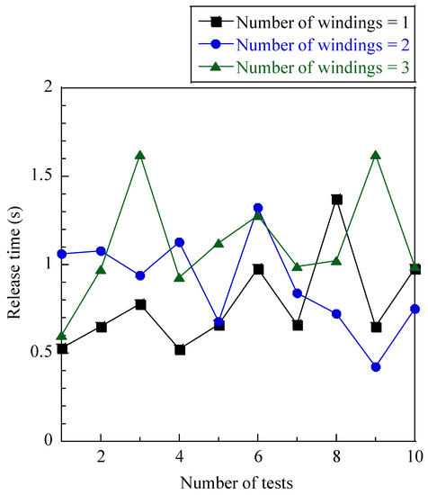 The function of the deployment mechanism must be confirmed by conducting at least 10 repeatability checks at room temperature, as several deployment tests are required during the development of CubeSat and testing phases such as run-in and acceptance testing [32]. The mechanism was therefore repeatedly released in the same test configuration as shown in Figure 10. The main objectives of the tests were to verify the repeatability of the mechanism and to identify the release time difference between single and triple wire windings. The release times are shown in Figure 12. The system functioned well in 10 repetitive activations without electrical malfunction on the circuit and no failure on the mounted resistor. However, the release time was noticeably varied in repetitive release tests because of the variable workmanship of applied tension on the knot of the wire. The mechanism’s average release time with one, two, and three wire windings in 10 repetitive triggers for each case were 0.77 s, 0.89 s, and 1.1 s, respectively. Thus, P-HRM has adequate repetitive release capability for application in actual space missions. There is no fast release requirement, but it is advantageous to cut the wire as soon as possible after the initiation of burn wire triggering in the mechanism to prevent electrical malfunction in the circuit. Furthermore, Park et al. [8] performed solar panel release tests as a function of the wire thickness within the qualification temperature range of −40 to +60 °C. The release time of the panel was slightly higher at low temperatures than that in the high-temperature environment because of the environmental effect on the variation in the heating time of the resistor. However, the release time variation from 0 to +60 °C was nominal.