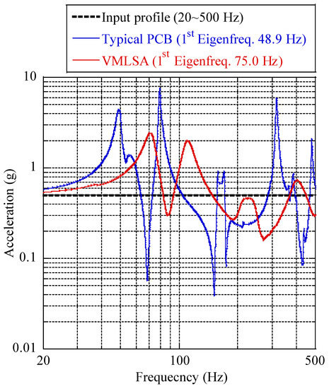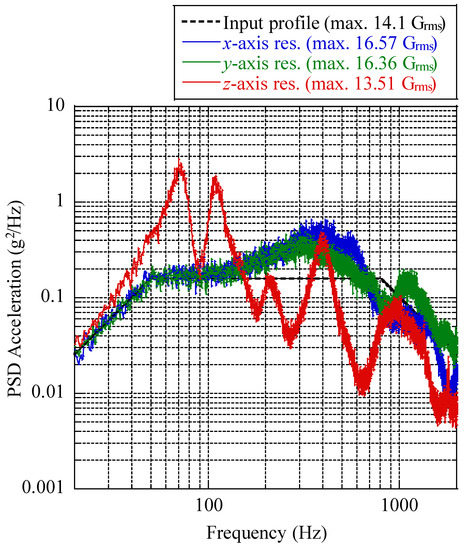 The VMLSA’s corresponding axis random vibration test results for each excitation axis are shown in Figure 16. The Grms values in each corresponding axis calculated from the PSD acceleration profiles under the x-, y-, and z-axis excitations were 16.57, 16.36, and 13.51, respectively. Compared to the input level random vibration profile of 14.1 Grms, the Grms of VMLSA was lower by a factor of 1.04 in the z-axis owing to the high damping achieved by the attached stiffeners.