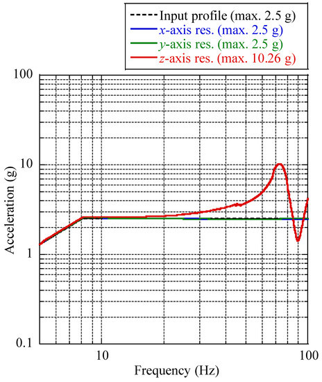 The VMLSA’s corresponding axis sine vibration test results during the x-, y-, and z-axis excitations are shown in Figure 15. The qualification level of full-level sinusoidal vibration loads for small satellites, as preferred by the QB50 System requirements and recommendations [34], was applied along the axis of the solar panel, but the z-axis was the most important axis because it produced the highest dynamic deflection in comparison to the others. The solar panel’s corresponding x-, y-, and z-axes maximum acceleration responses under a sinusoidal vibration input load of 2.5 g in each excitation axis were 2.5, 2.5, and 10.26 g, respectively. A maximum 10.26 g resonance response was observed at 75 Hz on the z-axis of the VMLSA during the same axis excitation.