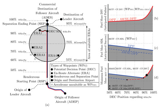 As depicted in Figure 1, a mission conducted with AWSE involves two airplanes, referred to as leader and follower, heading to the rendezvous starting point () in order to fly jointly in aerodynamic formation until passing the separation ending point (). We assume that the follower is positioned approximately 30 wingspans behind the leader, utilizing the energy of the leader’s wake. Along the segment between and , this procedure can significantly reduce the follower’s fuel burn. After passing , both aircraft continue to their respective destination airports. Adopting the idea of original DPP and adapting it to the characteristics of AWSE as initially proposed in [7], the SDL scenario assumes an accurate mission progress, including a full success regarding formation benefits. The expected AWSE benefits of the follower are therefore fully considered in fuel calculation according to Equation (2). On the contrary, when deriving trip fuel and contingency fuel for the case of diversion according to Equation (1), there is no consideration of expected AWSE benefits at all, assuming a total formation failure. In both cases, the routing of the follower remains unchanged until arriving at , reflecting a scenario in which the crew has no information on the imminent formation failure. Therefore, the crew has to cope with a situation, in which the option of saving fuel due to a more direct routing to or is not available. Due to this adaptation, the blue line in Figure 1c is vertically shifted to lower values (DPP → AWSE-DPP), affecting the minimum fuel value to be located at positions earlier along the track, as indicated by the dashed lines depicted in red and blue.
