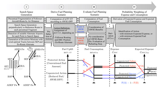 With completion of Step II, the set of available actions is complete and needs to be evaluated for both events, A (Formation Success) and B (Formation Failure). The possibilities of outcome are schematically depicted at the bottom of Figure 2, resembling an event-tree in their presentation. The three axes are associated with Steps II to IV and exemplarily show the effect of events A and B on the fuel consumption and the resulting expenses for two actions, differing in their level of protection. When following the path that originates in the unprotected action, the occurring event in transition from Steps II to III splits the string of outcomes in two possibilities. In the case of event A, represented as the blue path, the choice of an unprotected action results in the lowest possible fuel consumption due to the decreased take-off mass and formation success. When following this path to Step IV, the unprotected success is found to be the most favorable combination, regarding its fuel consumption as well as expense. In case of event B, the red path shows fuel consumption (on arrival at ) that is higher than its original fuel uplift (at )—caused due to a refueling stop at . The transition of unprotected failure to Step IV shows by far the highest value of expense.