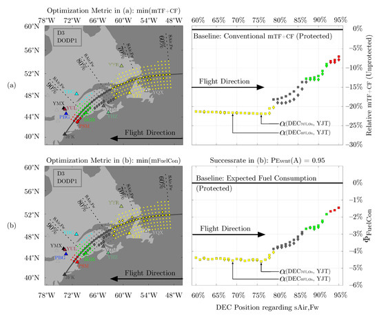 Overview on fuel planning scenarios with regard to (a) minimum fuel uplift, and (b) minimum fuel consumption for an assumed formation success probability of . Appropriate aerodromes are displayed as triangles, and the color code is used to assign decision points to the corresponding optimal . Squares represent located on the reference track. Small circles represent located offside the reference track. Diamonds represent offside the reference track with a higher savings potential than the corresponding on-track .