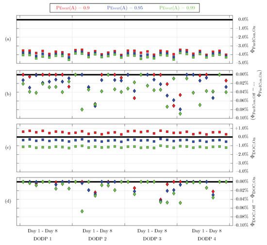 From a perspective of fuel savings, the minimum break-even probabilities depicted in Figure 6b show a distinct dependency on both the DODP and the atmospheric day. For DODP1 and DODP3, the break-even probability takes values up to , which is nevertheless clearly below the monetary break-even level. For DODP2 and DODP4, it can be observed that, even in the case of a diversion mission, fuel consumption can be reduced, resulting in required break-even probabilities of .