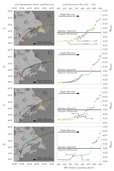 The savings potential regarding fuel consumption as presented in Figure 4a shows that all investigated combinations easily exceed . In some cases, the potential almost reaches values of —savings that come in addition to the AWSE-benefits. Between the segments, the fluctuation of savings potential shows a comparably small dependency on the DODP, but a high dependency on the meteorological days. The deviation of savings potential shows repeating sequences in each segment of Figure 4. The observable impact of the atmospheric effects, partially caused by routing adaptation and partially by effects on flight time, can be quantified to approximately . The remainder of the fluctuation is mainly induced by the success probability, which shows a significant dependency on the DODPs. Exemplarily comparing the values of D8, a similarity can be observed between the DODP1 and DODP3, showing a distinct variance between cases of high and low success probability. In segments 2 and 4, on the other hand, the results of D8 show a significantly smaller sensitivity on the success probability . This dependency can be confirmed for most other days, allowing the conclusion that the impact of success probability particularly depends on the investigated DODP. These exemplary combinations, D8 and DODP3 respectively DODP4, can be compared in Figure 5c,d in detail. While DODP4 is passing a convenient (aerodrome YYR) in direct proximity, the track of DODP3 is far-off. This offset results in longer detours for a diversion, which cannot even be compensated by placing off-track decision points and explains the dependency on the success probability.