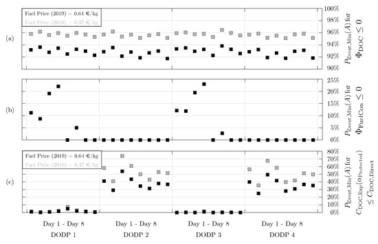 In order to operate on the edge of break-even condition, when conducting unprotected actions, a minimum success probability needs to be achieved. The monetary break-even probabilities are depicted for two levels of fuel price in Figure 6a. It can be observed that, for fuel prices as in the year 2019 (black markers), minimum values of success probability between and are sufficient in order achieve a monetary savings potential by AWSE-DPP, depending on the meteorological day.