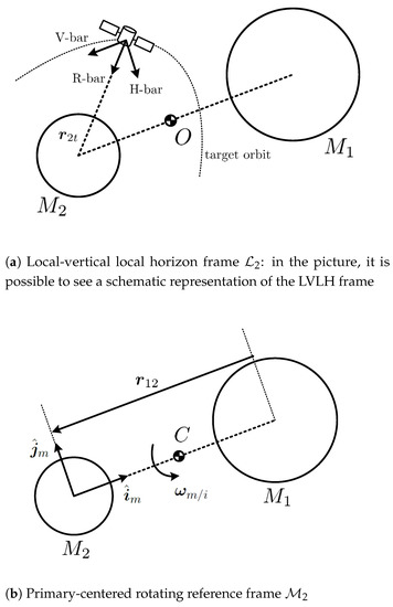 This section reviews the relative motion of the two spacecraft within the Earth–Moon system, or, more generally, the motion of three bodies under mutual gravitational attraction. The design of the rendezvous and docking maneuvers requires an accurate formulation of the relative motion; in this work, some working hypotheses are made, such as the elliptic and circular restricted three-body problem hypotheses. In addition, the equations of motions are formulated in non-inertial frames to make them more useful in the analysis and synthesis of the GNC loop. The complexity of this formulation stays in the fact that no closed solution exists for the problem. The interested reader can refer to [2] for more details. The appropriate reference frames are reviewed herein; then, translational and rotational dynamics are described.