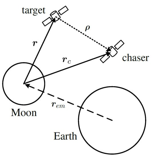 - and are the target and chaser positions with respect to the Moon, with norms , and , respectively.