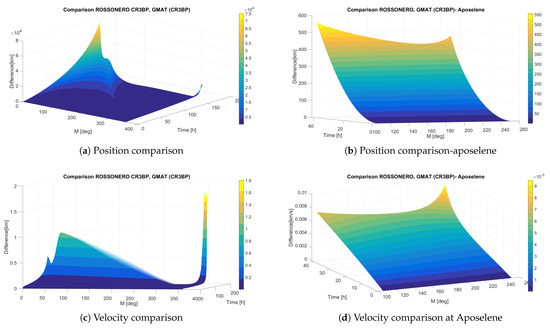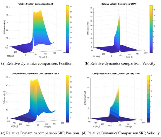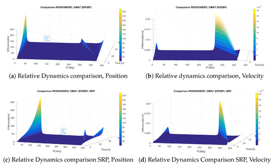 The next figures and present the comparison between ER3BP, CR3BP, and GMAT. Figure 7 shows the position (top column) and velocity (bottom column) differences between ER3BP and GMAT for one orbit period and the details at the aposelene. The numerical maximum and minimum values are reported in Table 1 and Table 2. Note that the aposelene region is the one that is assumed to provide better rendezvous properties. The position error increases with the simulation time, and it increases more rapidly as the starting point is closer to the periselene. This latter result is expected since the unmodelled dynamics play a larger role.