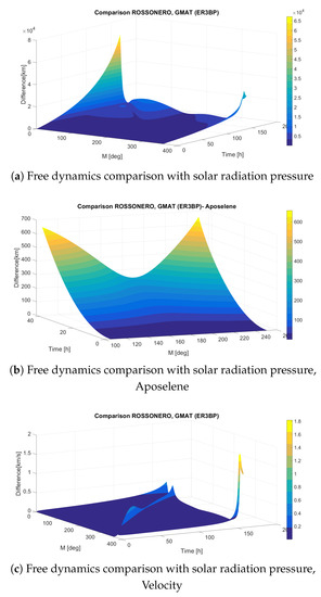 Analogous tests were performed using the CR3BP and shown in Figure 8 by using the same simulation procedure. It is possible to observe that, as expected, the CR3BP model has larger errors with respect to the Ephemeris than the ER3BP model. Moreover, the error amplitude can be tolerated for mean anomalies between and degrees. The numerical errors in Table 1 and Table 2 indicate the values propagated trajectory with respect to GMAT. The tables highlight how the propagation errors increase with the three-body restricted models with respect to the Ephemerides.