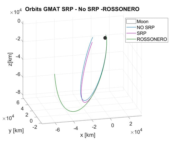 The orbit propagation in the three different models (GMAT, ER3BP, CR3BP) is shown in Figure 6; in each sub figure, it is possible to see all the trajectories propagated for the duration of seven days. The propagation duration is taken as representative of the orbital period of the target vehicle; even though the Ephemeris propagation is more realistic, the obtained trajectories require some active corrections to be considered orbits. The starting point at the periselene propagation is in blue, whereas, at the aposelene, it is in red.