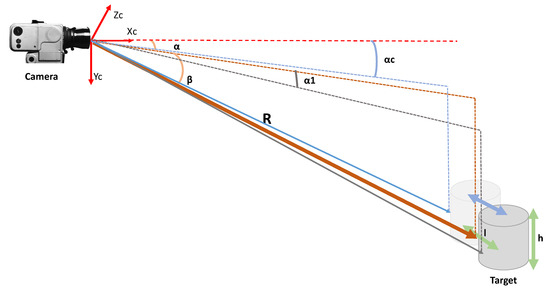 where . It is important to note that the constraint given by Equation (A34) is expressed in frame, so, as we can see from Equation (A34), the direction of cone axis depends on target’s attitude. From Equation (A29), we obtain the fictitious output .