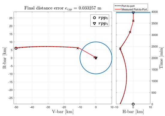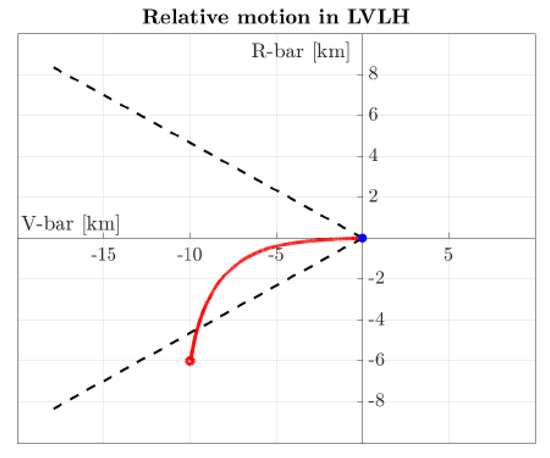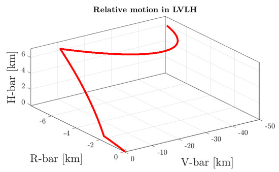 where the operator denotes the pseudo-inverse, whose computation is related to the degree of controllability of the system [29]. Starting from this result, we compute a two-impulse maneuver for the chaser, based on the ELERM in Equations (34) and (35).