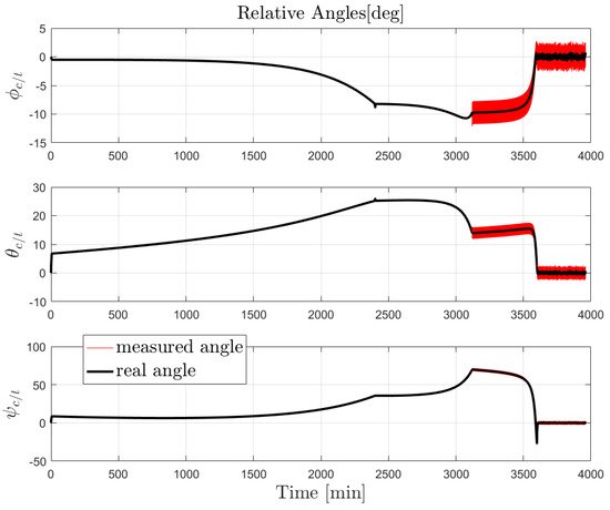 An example of the performance without and with the controller are shown in Figure A1 and Figure A2, respectively. The simulation considers a nonzero initial condition on the angular velocity with no damping at the beginning of the maneuver. The continuous rotation of the vehicle can be seen in Figure A1. After the insertion of the controller, the vehicle is stabilized to the desired attitude (zero in this case) as shown in Figure A2. The presence of the PID also allows the pointing of the cameras always towards the target.