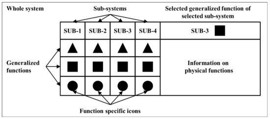 This method of information visualization supports parallel visual search for off-nominal system states, as the complexity of the display is reduced by only showing the icons for the generalized functions. If an off-nominal system state occurs, the icon for the affected generalized function changes hue. The operator can then identify off-nominal system states shown by a changing icon hue quickly by applying parallel search. Simultaneously, if information is displayed through changing icon hues due to the system state, it visualizes the means–end relationships between system functions of adjacent abstraction levels. The (secondary) effect of an off-nominal system state of one function on other system functions that share common means–end relationships immediately becomes visible due to the respective icons changing their hue (cf. Figure 3). A degraded vehicle health (generalized function) due to a loss of battery voltage (physical function), for example, impacts the required range to execute intended flight plan (generalized function). In this example, the icons for the vehicle health and range functions would change hue. Consequently, an operator should be able to quickly gather information about whole system performance on the generalized functions level of abstraction (i.e., which function(s) is operating off-nominally and which functions are affected by this condition). Information on physical functions and physical objects is (or can be) displayed in a separate window or multiple separate windows as desired by the operator.
