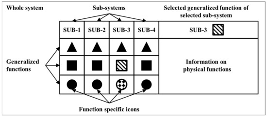 Schematic illustration of the proposed display design concept for off-nominal system state indications of two generalized functions of subsystem SUB-3. The display visualizes which generalized functions are currently affected by a failure and which state they are in through the different hues. In the figure, the different hues are visualized by the patterns of the icons.