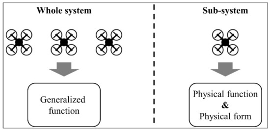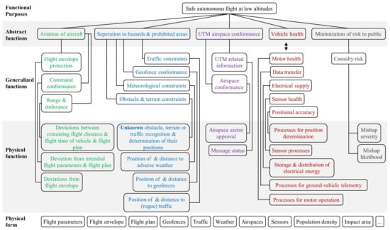 The functional purposes level is the highest level of abstraction. At this abstraction level, the reasons and purposes of the system are described. The functional purpose of a system consisting of multiple autonomous sUAS is the safe autonomous flight operation at low altitudes. The abstract functions represent the second level of abstraction. Abstract functions are means to accomplish the functional purposes. The abstract functions were defined as functions that aim to mitigate the safety risks identified by Young et al. [29]. After defining the abstract functions, the subsequent levels of abstraction were defined. Thus, the abstract functions were decomposed into generalized functions, physical functions, and physical forms. In the following, the abstraction levels for each safety risk are described.
