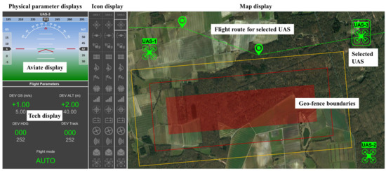 For this use case application, the system is defined by the whole fleet of sUAS that are being supervised. Therefore, the whole system consists of all sUAS, of which each sUAS represents a separate but similar or even identical subsystem. In accordance with the principles of the proposed display design concept, information on generalized functions (e.g., geo-fence conformance) is presented for all subsystems, i.e., for all sUAS that are being supervised. Information from the physical functions (e.g., the distance between a sUAS and a geo-fence) and physical forms (e.g., the position of a sUAS or a geo-fence) levels of abstraction is presented only on request of the operator for the selected sUAS (i.e., subsystem, cf. Figure 4).